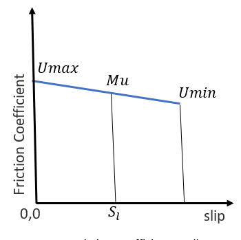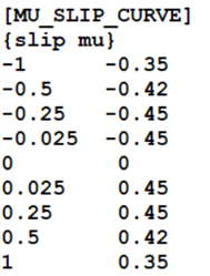 If there is a [MU_SLIP] present in the tire property file than the friction coefficient is calculated by interpolating the data in the table. The data in [MU_SLIP] curve should be monotonically increasing. An example of such table is shown below: