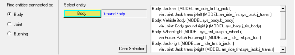 This tool allows you to find entities which are connected to a selected entity (body, joint, or bushing).