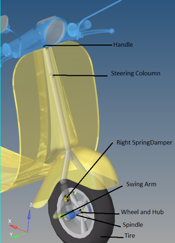 The Double Side Leading Link Suspension system can be used in front half vehicle or full vehicle models of a two wheeler. The default geometry and mass approximate that of a two wheeler scooter, but the model and data can be revised to reflect any size two wheeler.