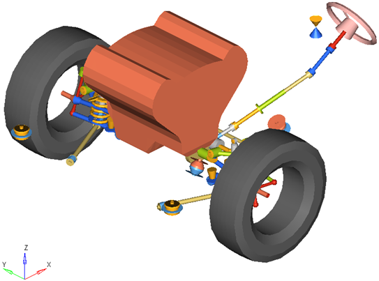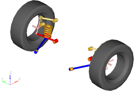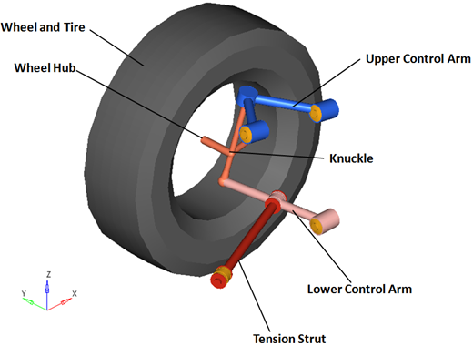 In conventional designs the coil spring (or optionally a torsion bar), shock absorber, and jounce bumper act between the lower control arm and chassis. The lower control arm carries most of the load and defines the motion of the lower ball joint location on the knuckle. The upper control arm carries smaller loads and defines the motion of the upper ball joint location on the knuckle. The steering motion of the knuckle is controlled by the tie rod and the motion of the steering system. In the vehicle library the steering systems contain the tie rod.