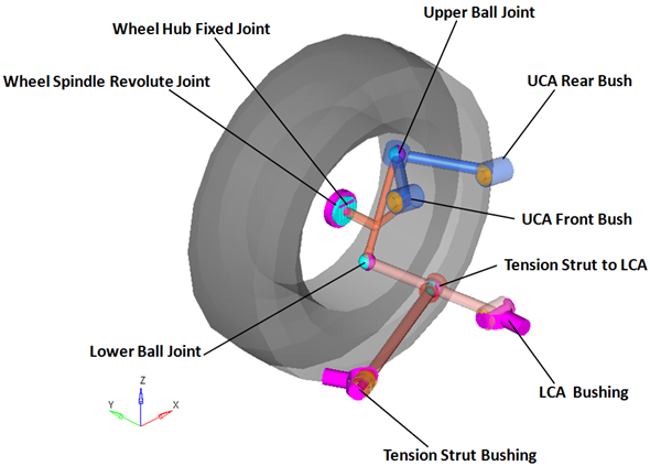 | UCA Front Bush | Bushing | Upper Control Arm | Upper Control Arm | UCA Front Bush | When the Compliant option is set to No, this bushing becomes a revolute joint. |