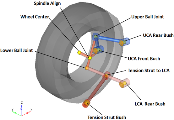 | UCA Rear Bush | Bushing | Upper Control Arm | Subframe, Vehicle Body or Ground | UCA Rear Bush | When the Compliant option is set to No, this bushing is deactivated. |
