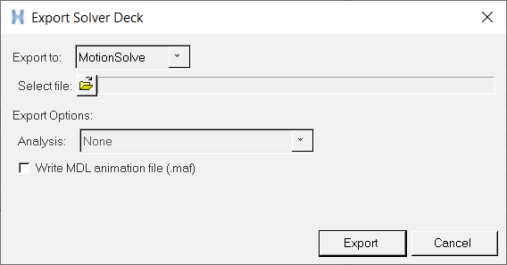Option Description Analysis From the Analysis drop-down menu, select an analysis that you want to export with your model. This option is active only when there are multiple analyses in the model. Write MDL animation file (.maf) to create a reduced-size MDL file to only be used in HyperView. Export Solver Deck The Export Solver Deck dialog for the Adams solver mode has an additional choice to specify the .mtx path as Absolute or Relative. The .mtx file is a matrix file written out along with the solver deck file when the model contains flexbodies.