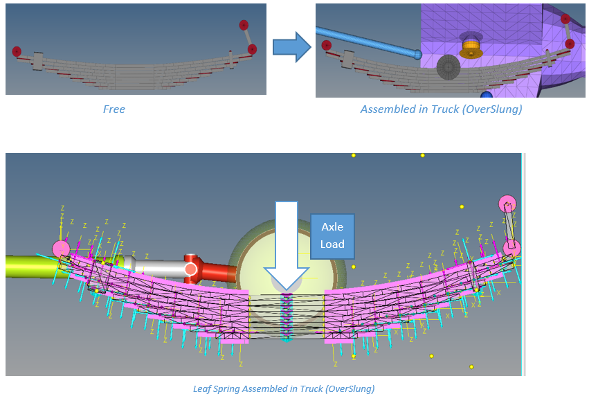 To model the leaf spring with the Assembled and Loaded option, you will need the profile of the leaf spring in the final Loaded Position (after assembling in truck) along with the axle load on the leaf spring. It helps to build the leaf spring model with the provided shape, with preloads on each beam (each leaf in a leaf spring is modeled with a set of beams), which gives the overall load of the provided axle load.