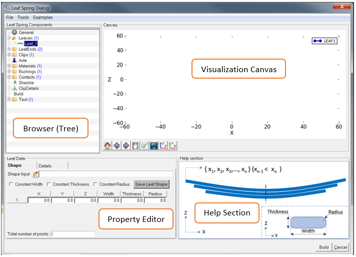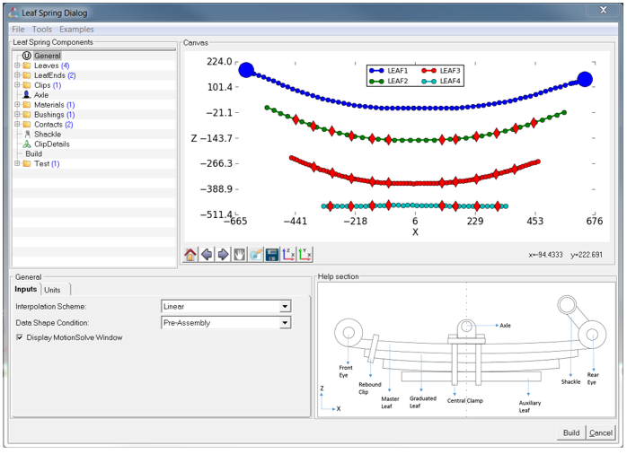 The Leaf Spring Builder is used to model leaf spring using rigid bodies, beams, and contact forces. You can enter information about the number of leaves, the leaf shapes, cross-sections, material properties, contact properties, shackle length (if your spring employs a shackle), nominal axle load and other information, to create an MDL system definition, which can be imported into a suspension or full vehicle model.