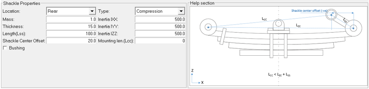 By selecting the bushing option, a new Shackle Bushing option is displayed. The Shackle Bushing drop-down menu lists all of the bushings that are added in the Bushings Component.