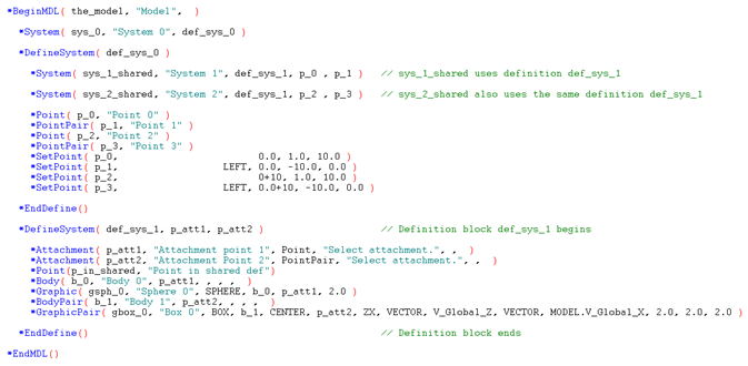 Accordingly, it is possible that multiple instances can be instantiated off of the same definition block. Such instances are referred to as shared instances or linked instances. Therefore, two or more systems instantiated by referring to the same definition block are said to be shared systems or linked systems. The sharing can only be established through authoring a model using the text editor in the MDL language. It is not possible currently to create shared instances using the MotionView graphical user interface. An example is show below: