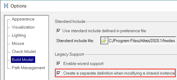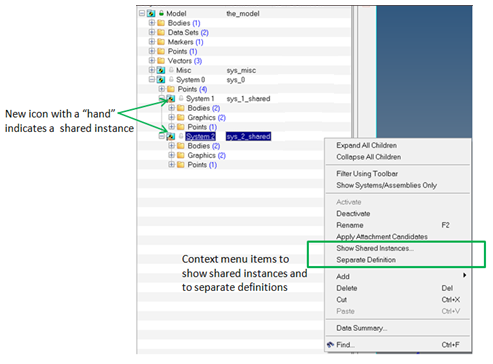 The graphical user interface of MotionView version 10.0 (and earlier versions) handled shared instances as though they originated from different definitions. Once the model with shared instances was loaded into MotionView and any of the shared instances got modified, the linkage was severed and MotionView saved the instances referring to different definitions. This inherent behavior was removed in version 11.0 and 12.0. In other words - modifying a container entity by adding, deleting, or changing the topology of an entity within resulted in the same change being applicable to the other instance that shared the same definition.