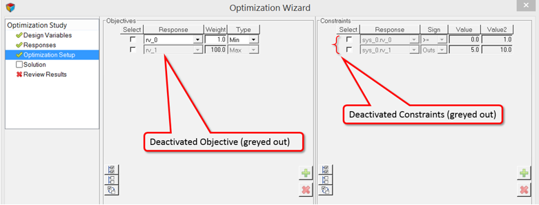 - If a Response Variable is suppressed, the corresponding objective and constraint (which uses the RV) will automatically be greyed out and it will not be used for the study (see below).