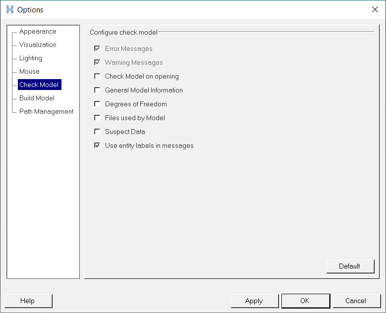 The Check Model options allow you to select which information from the model file will be displayed when the Check Model tool is run.