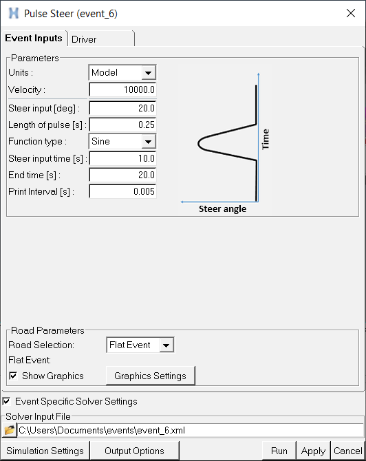 The input to the event can be a steering wheel angle, and you can set the pulse magnitude and width. The pulse can be input as a sine, step, or ramp function and you control the width. The Altair Driver is used to maintain a constant speed, and standard outputs for the vehicle and tires are included in the Tire System and the Output Requests system. A plot template is available to plot the results.