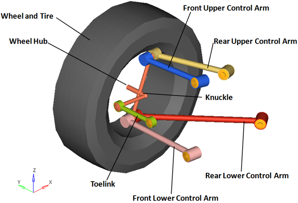 The multi-link suspension derives its name from the fact that it is made up of three or more links. The rear Multi-link suspension contains five links, and is generally used on higher end luxury cars. The multi-link suspension is derived from the SLA suspension, in that each wishbone (or A-Arm) is replaced with two links. This suspension offers flexibility to the designer, since each link’s location can be determined independently. In this suspension we use the term “link” and “control arm” interchangeably. Traditionally a link is a rigid body with two connections, and a control arm has three connections.
