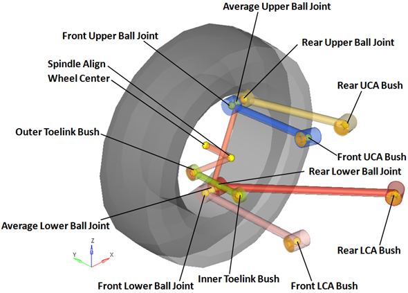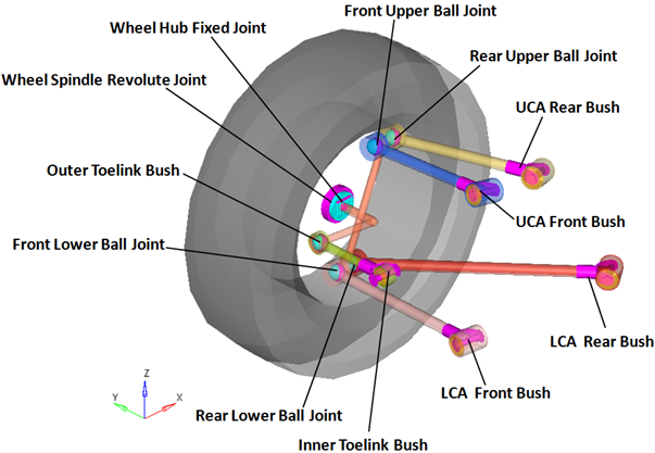 | Outer Toe Link Bush | Spherical | Toe Link | Knuckle | Outer Toe Link Bush | When the Compliant option is set to No, the compliance for this joint is turned "Off" and behaves as a pure spherical joint. |
