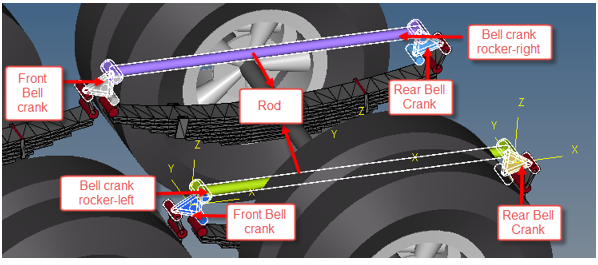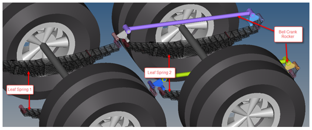 In the bell crank linked leaf springs, two sets of leaf springs are used and is mounted to the frame at two points. Bell crank rocker is attached in the rear-rear leaf spring. It is used to convert translational motion of one object into translational motion of another object operating at different angles. It acts as an equalizer when the load is applied.
