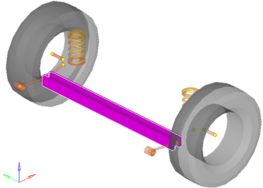 • The model contains beams to represent the twist portion of the axle. This is a good representation of the axle early in a vehicle program. As a design is refined, the axle twist should be represented by a flexible body.