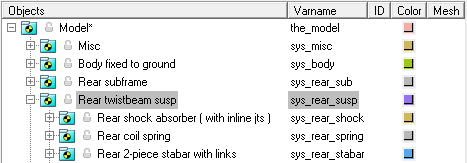 The image below shows the Project Browser view of the systems in a fully populated rear suspension model. The Rear twistbeam susp system has five “child” systems.
