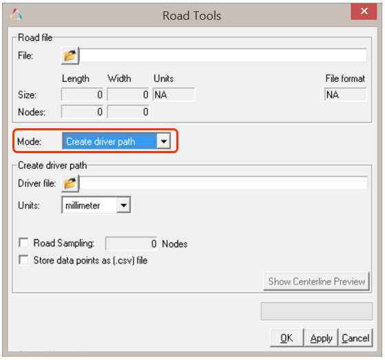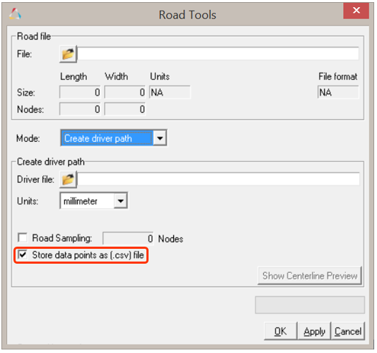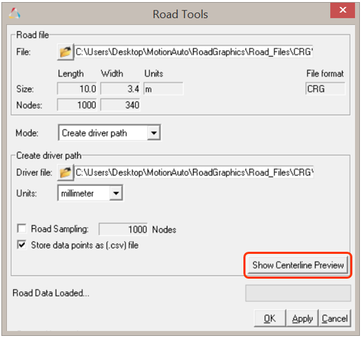 Besides creation of a graphic, the Graphic Builder Tool also provides you with the ability to extract centerline from road description files using the “Create Driver path” tool. This tool extracts the centerline in a (.ddf) file, which is a teimorbit format or as comma separated value (.csv) format. Similar to the “create graphic” utility, the extraction of centerline is supported for all three types of road visualization: CRG, RGR, and 3D spline road.