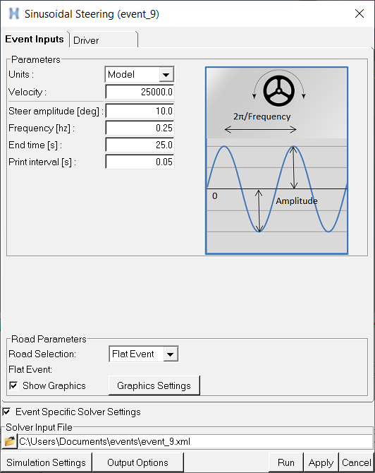Parameter Description Units Velocity unit selection (Model, m/s, km/h, mph). Velocity Initial vehicle velocity. Steer Amplitude Amplitude of the steering input (degrees). Lean Amplitude* Amplitude of the lean input (degrees). Frequency The frequency of the steering input (hertz). End time Absolute end time of the event, in seconds. Print interval Time interval of data output to the plot file (.plt) and graphics file (.h3d). *Applicable only for Two-wheeler events.