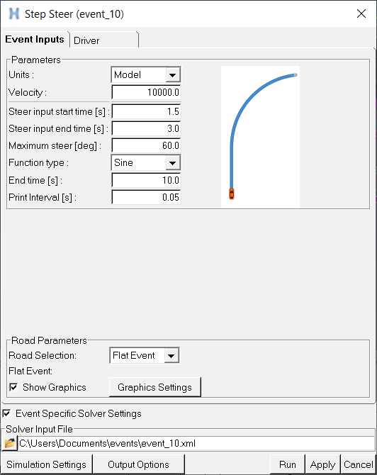 Parameter Description Units Velocity unit selection (Model, m/s, km/h, mph). Velocity Velocity of the vehicle during the event. Steer input start time Initial Steer start time (absolute time in seconds). Lean input start time* Initial Lean start time (absolute time in seconds). Steer input end time Ending time for application of the step steer in seconds (absolute time). Lean input end time* Ending time for application of the step lean in seconds (absolute time). Maximum steer Maximum Steering input value (default 60 degrees). Function type Sine, step or ramp function (used to transition from 0 degrees steer to the maximum steer value). End time Absolute end time of the event, in seconds. Print interval Time interval of data output to the plot file (.plt) and graphics file (.h3d). *Applicable only for Two-wheeler events.