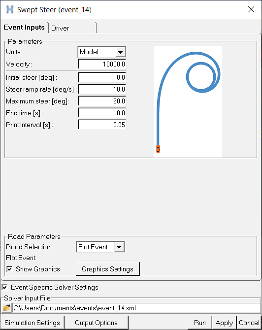 Parameter Description Units Velocity unit selection (Model, m/s, km/h, mph). Velocity Velocity of the vehicle during the event. Initial Steer An initial steer angle of the vehicle. Initial lean* Initial demand lean angle of the vehicle. Steer ramp rate The rate the steering is increased (degrees/sec). Lean ramp rate* The rate at which the demand is increased (degrees/sec). Maximum steer The maximum steering angle in degrees. End time Absolute end time of the event, in seconds. Print interval Time interval of data output to the plot file (.plt) and graphics file (.h3d). *Applicable only for Two-wheeler events.
