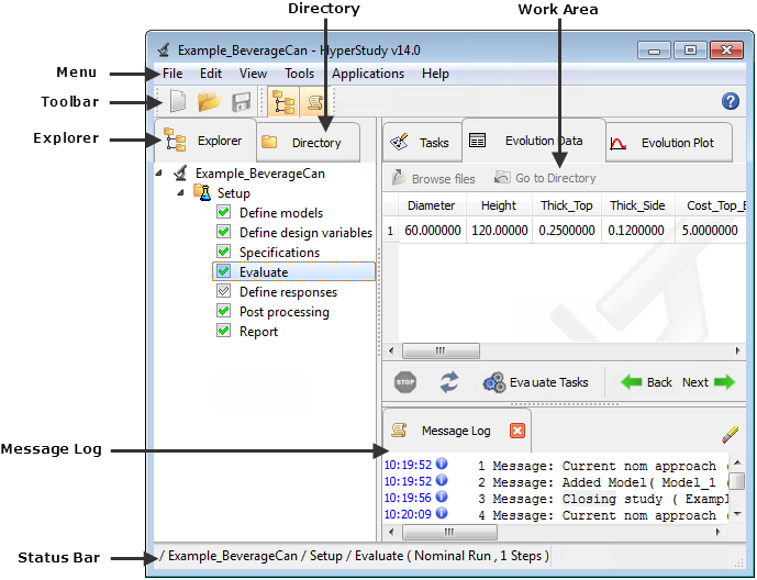 Further approaches such as DOE, Optimization, and Stochastic studies are common to all applications. Refer to the HyperStudy Online Help for additional information.