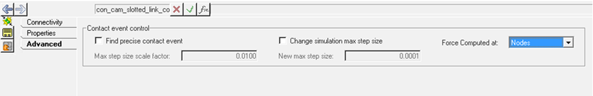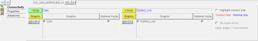 3. From the Connectivity tab of the Contact panel, resolve Body I to Cam and Body J to Slotted_Link. This automatically selects the respective graphics that are attached to these bodies.