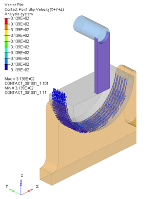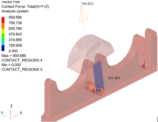 You were also able to setup a transient analysis to calculate the contact forces between these geometries and post-process the results via vector and contour plots, in addition to plotting the contact force requests.