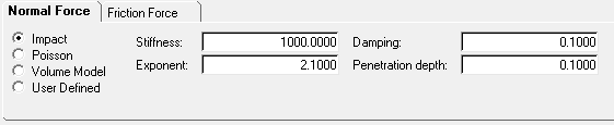 7. Specify the contact properties. Click the Properties tab to display the Normal Force and the Friction Force property sub-tabs within the Contact panel. In this model, you will use an Impact model with the following properties: