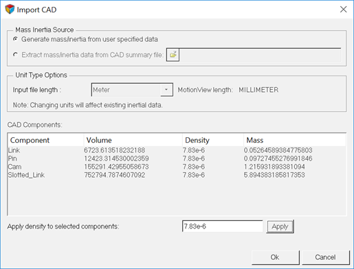 MotionView invokes HyperMesh in the background to mesh the geometry and calculate its volume properties. The Import CAD dialog is displayed. From this dialog, you can review the components in the CAD file as well as their mass, density, and volume properties.