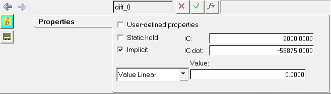 This is an implicit differential equation that has a constant (). The initial condition of the differential equation (IC) and its first derivative (IC dot) are known (given).