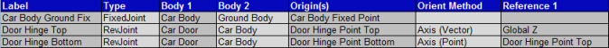 To represent the locking mechanism of the car door, you will use a sensor activated fixed joint between the Car Body and the Door Body that initially is deactivated. The fixed joint will need to be created using XML templates since the MotionView interface allows joints to be created using bodies and points. In this case, you need to create the joint between two initially non-coincident markers.