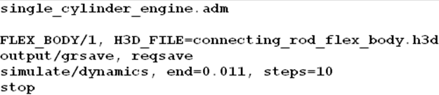 We will modify the ACF file to include an argument that would generate a flexbody H3D file. MotionSolve internally calls OptiStruct, which generates the H3D flexbody file. The ADM and ACF is translated into MotionSolve XML format and solved. MotionSolve outputs the results H3D file, which can be loaded in HyperView for animation. In HyperView, external graphics (for piston and crank) can be added for visualization.