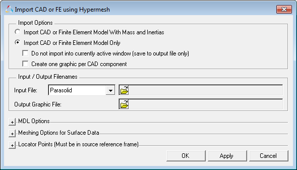 You can submit ADAMS dataset language files (ADM and ACF) directly to MotionSolve, thus avoiding manual translation. The ADAMS model is first automatically translated into the MotionSolve XML format and then it is solved. If the ADAMS model has a flexible body represented by the MNF and MTX files, the MotionView Flexprep utility will be used to generate an H3D flexible body file (using the MNF file). This H3D flexbody file is the MotionSolve equivalent of the ADAMS MNF and MTX files. It holds the mass and inertia properties, as well as the flexibility properties which allow the body to deform under the application of loads. The deformation is defined using a set of spatial modes and time dependent modal coordinates.