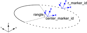 Figure 14. ArcFromRadius graphic typeThe ArcFromRM graphic type is defined by two markers. The origin of the arc is set to the origin of the marker specified by center_marker_id; also the Z axis of this marker determines the normal to the plane of the circle. The origin of the r_marker_id is used to determine the radius of the circle as , where is the position of the center_marker_id and is the position of the r_marker_id. The arc is drawn starting from the Y axis of the center_marker_id, in a counter clockwise fashion for the included angle, specified by rangle.