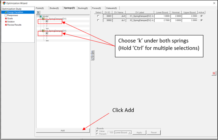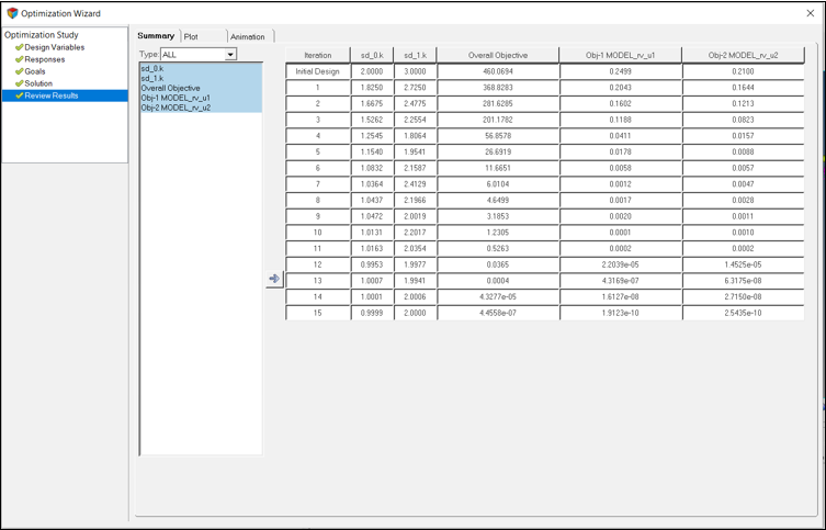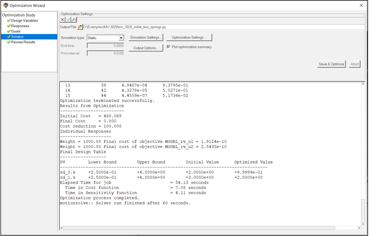 The process of optimization starts with setting up a model in MotionView. MotionView’s Optimization Wizard is used to setup design variables, responses and objectives. The wizard also guides the user to run and plot/print results of optimization. It is also able to export a design from a particular iteration into a new MDL for further analyses.