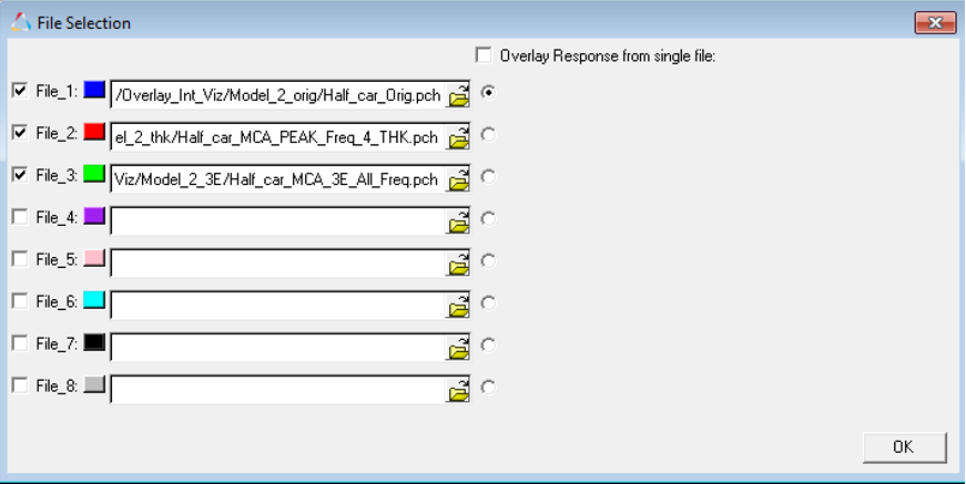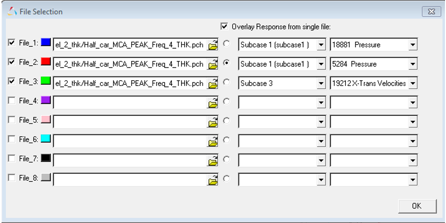 You can overlay the results between different result files or within the same result file. Different result files for results overlay between them are loaded in the File Selection dialog, which is invoked by clicking the Vehicle Response Tab.
