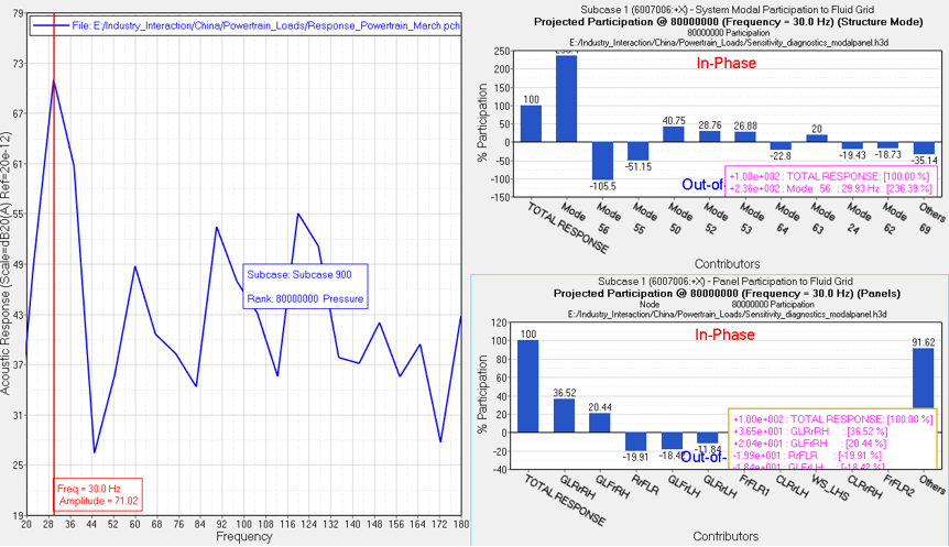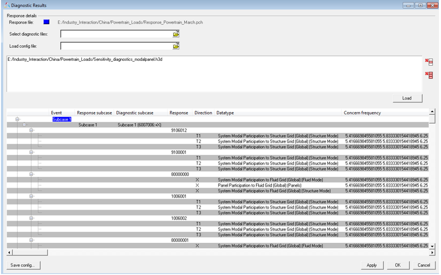 NVH problems are typically characterized by frequencies where a response is over the targeted value. As a result, you are often more interested in understanding the system behavior at these frequencies of interest, referred to as concern frequencies. To reduce the volume of diagnostic data, a common practice is to request a diagnostic request for diagnostic result output only at the concern frequencies of the respective response. The Diagnostic Results dialog of the Integrated Diagnostics utility captures the concern frequencies in a separate column.