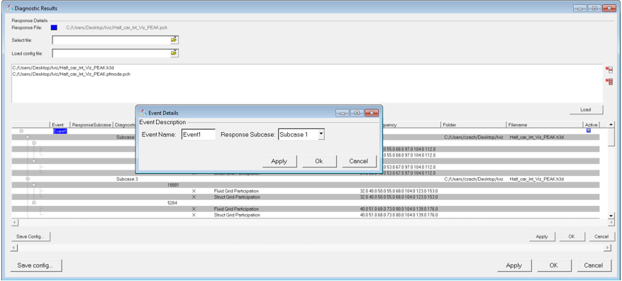 In CAE simulation, each event is typically associated with one or more analysis subcase(s) in which system responses are calculated. In NVH, responses are typically driver or passenger touch or experience points, such as steering wheel vertical response, inboard seat track bolt response, or left ear sound pressure level, for example. In the Integrated Diagnostics utility, you are expected to associate response subcases to a particular event. Each response subcase can include multiple responses and directions. Each response direction can then be associated with a number of diagnostic results.