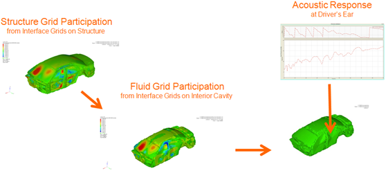 - The body structure grids vibrate, exciting the interior cavity fluid grids, which eventually generates an acoustic response (which is typically a driver’s or passenger’s response).