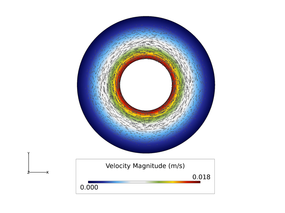 The problem consists of two concentric pipes with water filling the void between them, as shown in the following image, which is not drawn to scale. The radius of the outer pipe is 0.0468 m and the radius of the inner pipe is 0.0178 m. The inner cylinder rotates at 1 rad/sec and the outer cylinder is fixed. The induced flow is laminar and exhibits a steady state behavior. The rotation of the inner cylinder causes the fluid to rotate due to viscous shearing near the wall. As the outer cylinder is fixed, a velocity gradient is generated as a function of radius within the flow domain.