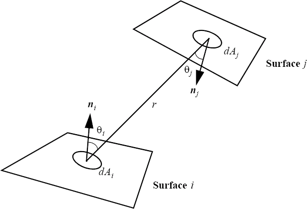 where Ai and Aj are the areas of surfaces i and j , respectively; and are the angles between the line connecting to and the normals to surfaces to ; respectively; r is the distance from to ; and is the visibility function, it is equal to one if to see each other, otherwise it is zero.