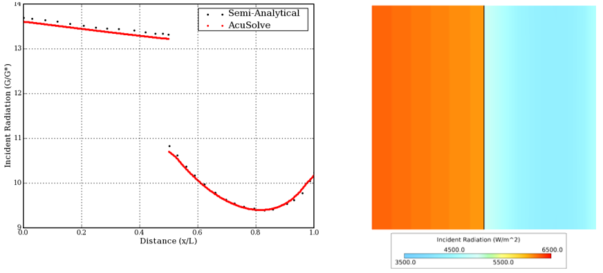The internal surface between the two equal solid portions of the cube is specified to be a completely specular boundary condition. AcuSolve results are compared with accepted numerically derived results of incident radiation, as described in Muresan (2004) and Łapka (2012). The close agreement of the AcuSolve results and the published data validates the solver’s ability to model cases with semi-transparent media with differing material properties using the discrete ordinates radiation model.