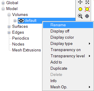 The items in the Data Tree are separated into two main areas, Global and Model. The Global tree item contains geometry independent settings that apply to the AcuSolve simulation, such as the physics to be modeled, the solution strategy, material properties and geometry independent mesh controls. The Model branch in the Data Tree contains settings that apply to specific portions of the geometry of the model, such as boundary conditions, material used for a volume region and meshing attributes that apply to a specific component of the model geometry.