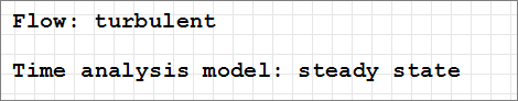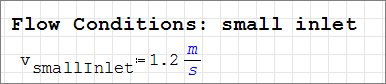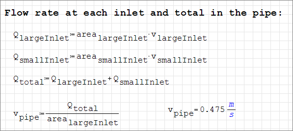 Based on mass conservation, the combined flow rate (Q) yields a velocity of 0.475 m/s downstream of the small inlet. This value is useful in determining the Reynolds number, which in turn can be used to determine if the flow should be modeled as turbulent, or if it should be modeled as laminar.