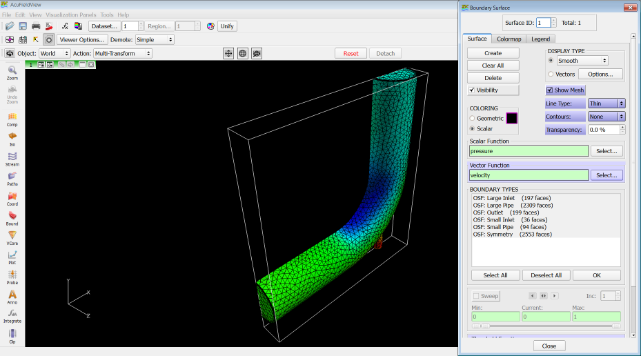 When AcuFieldView is started directly from AcuConsole, the model will be displayed in an isometric view with a Boundary Surface dialog open. The initial view is shown in perspective, with an outline around the model. You will manipulate the view in the next steps, and in later steps will view different flow characteristics using the Boundary Surface dialog.