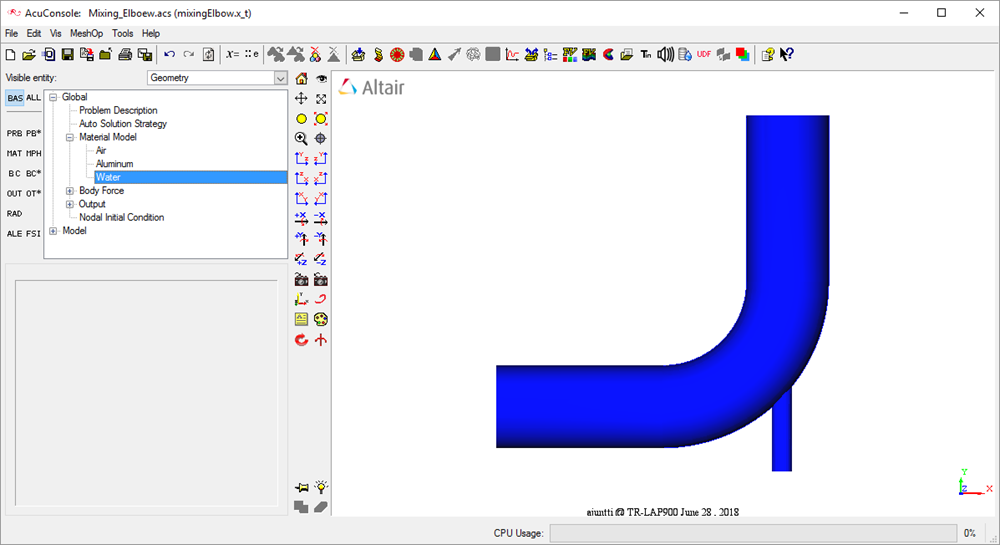 Prior to running through this tutorial, copy AcuConsole_tutorial_inputs.zip from <Altair_installation_directory>\hwcfdsolvers\acusolve\win64\model_files\tutorials\AcuSolve to a local directory. Extract mixingElbow.x_t from AcuConsole_tutorial_inputs.zip.