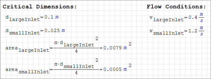 The diameter of the large inlet is 0.1 m, and the inlet velocity (v) is 0.4 m/s. The diameter of the small inlet is 0.025 m, and the inlet velocity is 1.2 m/s.