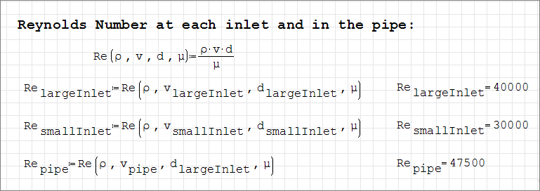 The Reynolds numbers of 40,000 at the large inlet, 30,000 at the small inlet, and 47,500 for the combined flow indicate that the flow is turbulent throughout the flow domain.