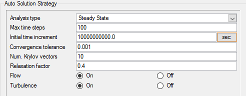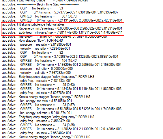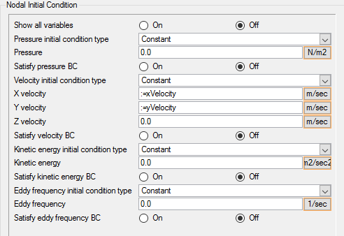 For the SST and K-Omega turbulence models, you need to enter the initial values for Kinetic energy and Eddy frequency. If you have a reasonable estimate of these values, you can enter them directly in the fields. One option is to use the same values that are assigned at the inlet boundary. In the absence of good estimates for the initial conditions, it is also possible to let AcuSolve perform an automatic initialization of the turbulence variables. By leaving these values set to zero, AcuSolve will trigger an automatic initialization of these variables.
