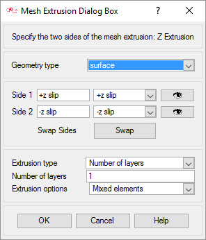 The final step in the setup of the meshing for the airfoil is the creation of a mesh extrusion attribute. This extrusion will be defined such that a single element is created across the span of the airfoil.